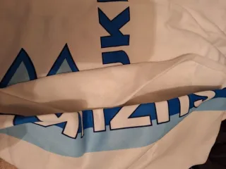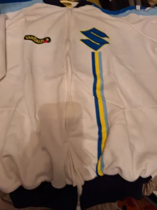 Cazadora deportiva con un diseño llamativo. - Logo de Suzuki en el pecho. - Rayas verticales en azul y amarillo. - Detalle de logo Garibaldi en la manga. - Puños y cuello elásticos.