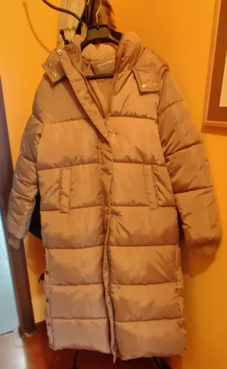 Cazadora larga acolchada de color beige. Es una prenda de abrigo con un diseño moderno y funcional. - Cierre de cremallera. - Bolsillos laterales. - Con Capucha - Botones a presión en los laterales.