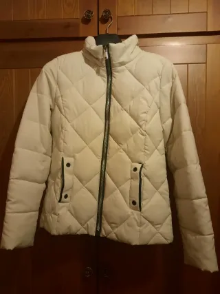 Cazadora acolchada de Zara en color beige./blanco roto. Presenta un diseño moderno y cálido. - Cierre de cremallera frontal. - Bolsillos laterales con cremallera. - Cuello alto. - Los puños se regulan con un velcro por lo que la goma del puño queda mas fija. - A recoger en Llinars del Vallès. - Abriga muchísimo,pero me ha quedado pequeña. - La he usado incluso para ir a la nieve y no pasas nada de frio. - Esta en perfecto estado.