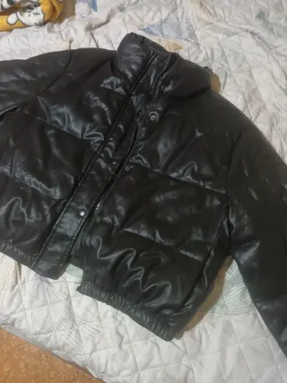 Cazadora de piel negra con un diseño acolchado. - Cuello alto - Cierre de botones clips. - Bolsillos laterales. Comprada online 200€ No envio