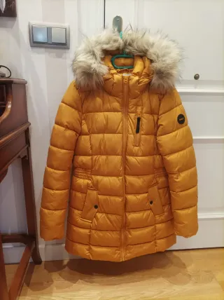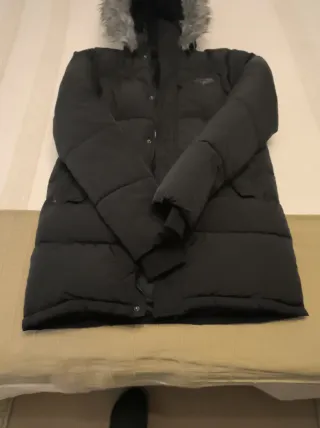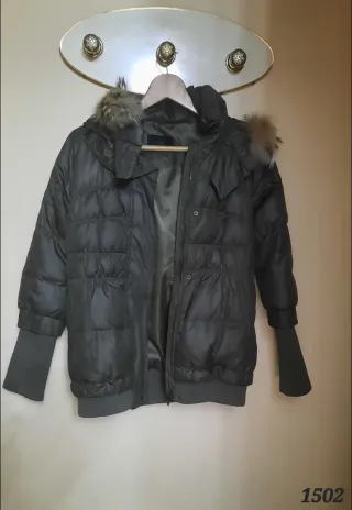 Cazadora negra de la marca JD, en talla S. Se encuentra como nueva, con muy poco uso. - Diseño acolchado. - Capucha con pelo sintético. - Cierre de cremallera y botones. - Bolsillos frontales.