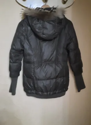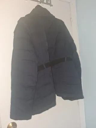 Cazadora acolchada con cuello subido en color negro grisaceo oscuro con cordones regulables en el interior en la parte de abajo. Mide de sisa a sisa 61cm y de largo 60cm. Esta usada en muy pocas ocasiones manteniendose en muy buen estado.