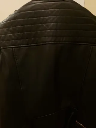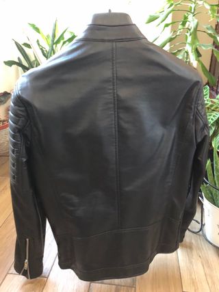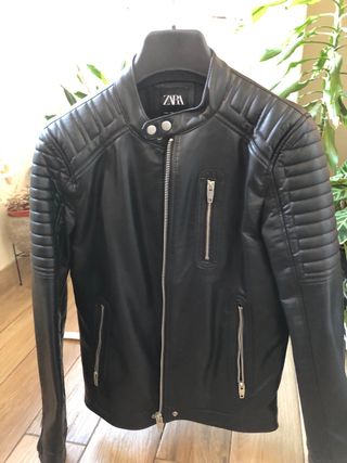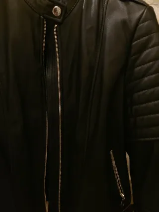 Cazadora estilo motero de Zara. Diseño moderno y versátil. - imitación piel Talla M pero da poca talla -puesta una vez me la regalaron y me queda pequeña - Cuello redondo con cierre de botón. - Cremallera frontal. - Bolsillos con cremallera en el pecho y laterales. - Detalle acolchado en hombros y mangas.
