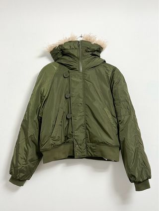 Chaqueta acolchada corta en color verde militar, con capucha y ribete de pelo sintético. Cierre con cremallera y botones, bolsillos frontales y bolsillo en manga. ▪️Talla: M ▪️Marca: Stradivarius ▪️Estado: Nueva con etiquetas Escríbeme ante cualquier duda.