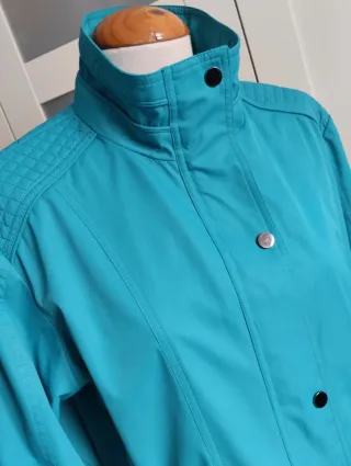 Cazadora de estilo moderno en color azul turquesa. - Cuello alto. - Cierre de botones. - Bolsillos con cremallera. - Detalle acolchado en hombros y puños. Sólo necesita lavar. Por eso su precio tan bajo. Está impecable.