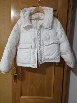Cazadora acolchada estilo Puffy de Bershka. - Diseño moderno y voluminoso. - Cierre frontal con cremallera. - Bolsillos laterales con cremallera. - Capucha integrada desmontable. MÁS ROPA EN MI PERFIL. NO ENVÍO.