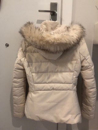 Cazadora acolchada con capucha. - Cierre de cremallera. - Bolsillos laterales. - Detalle de pelo en la capucha desmontable. - corchetes a los laterales para dar más amplitud al abrigo Precio tienda 120 euros