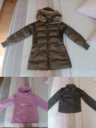 Pack de tres cazadoras para niña en talla 10/12 años. Incluye una cazadora marrón acolchada con capucha de pelo, una cazadora rosa con capucha y una cazadora tipo cuero negra. - Cazadora acolchada marrón con detalles elásticos en cintura y puños. - Cazadora rosa tipo anorak con capucha y cordón ajustable en bajo. - Cazadora negra efecto cuero con cremalleras decorativas.