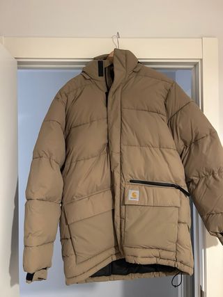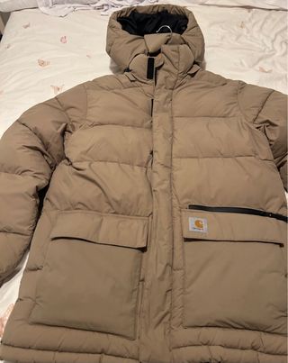 Cazadora Carhartt de color marrón claro, con un diseño moderno y acolchado. Es una prenda muy cálida y cómoda. - Cierre de cremallera. - Bolsillos frontales con cremallera. - Capucha ajustable. - Logo de la marca en el bolsillo.