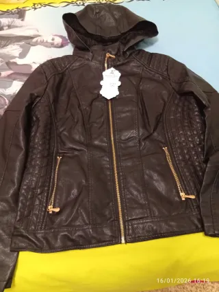 Cazadora de polipiel con un diseño moderno y detalles que la hacen única. - Capucha integrada. - Cremalleras doradas. - Diseño acolchado en hombros y costados.