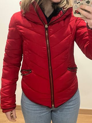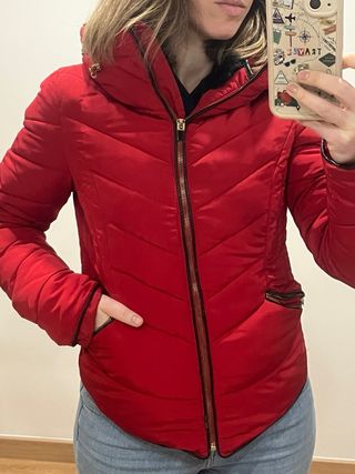 Cazadora acolchada de color rojo con un bonito estampado. Solo se ha puesto un par de veces. - Diseño acolchado. - Estampado en la prenda. - Cierre de cremallera frontal. - Bolsillos laterales con cremallera.