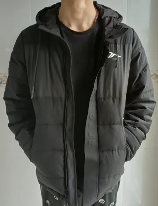 Cazadora negra unisex con capucha, ideal para cualquier ocasión. Está en muy buen estado. - Diseño combinado: tejido de sudadera y acolchado. - Cierre de cremallera. - Bolsillos laterales con cremallera oculta.