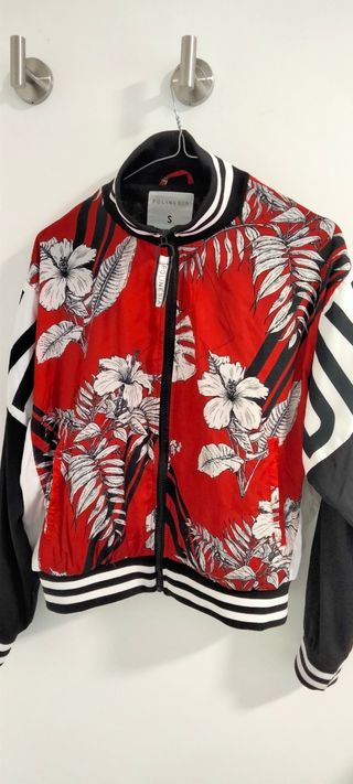 Cazadora tipo bomber marca Polinesia talla S. Estampada en colores rojo blanco y negro. Muy divertida y original. Combina bien con pantalón negro blanco o vaquero. Aunque es talla S debe ser una 38-40. Tiene un bolsillo interior. Por dentro se nota que no está nueva pero está bien conservada (ver foto)