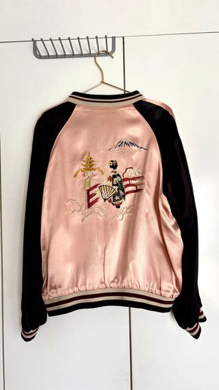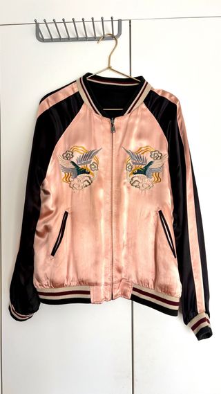 Chaqueta bomber reversible de Zara, en tonos rosa y negro, beige y negro la parte reversible. Está confeccionada en un tejido satinado suave. - Diseño reversible, con dos estampados diferentes. - Detalles en color beige en las mangas y el bajo. - Cierre de cremallera.