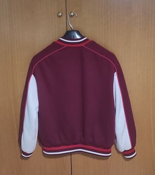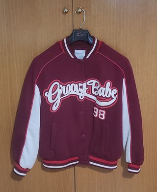 Cazadora bomber de la marca Bershka. - Diseño con mangas blancas y rojas y detalles en contraste. - Estampado Groovy Babe en la parte delantera. - Número 98 bordado.