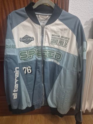Cazadora estilo bomber con diseño inspirado en el automovilismo. - Estampado Motor Sports, Grand Prix, Speed y All Terrain. - Detalle de número 76 y logo Racing Pro Team. - Cierre de cremallera frontal. - Cuello y puños elásticos.