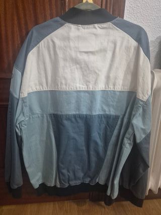 Cazadora bomber de la marca Tennis con un diseño original y llamativo. Es una prenda ideal para entretiempo. - Mangas con estampado floral azul y blanco. - Cuerpo central con estampado geométrico en tonos azules y crema. - Cuello, puños y bajo con acabado acanalado. - Cremallera frontal dorada. - Acabados cuidados: Los puños y el bajo presentan un ribete elástico decorativo. Hago envío, también se puede recoger en la calle Jaime el conquistador (CP: 28045, cerca de los metros Legazpi y Delicias).