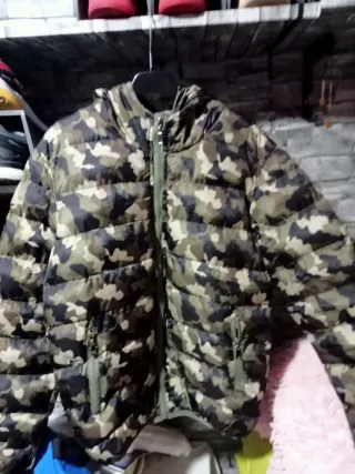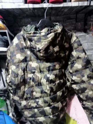 Cazadora con estampado de camuflaje en tonos verdes y marrones. - Cierre de corchetes. - Bolsillos delanteros. Está nueva. Solo estrenada. Tejido engomado. Resistencia al agua.