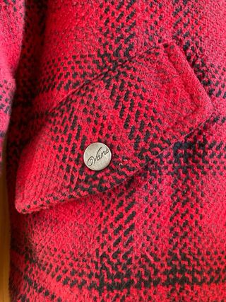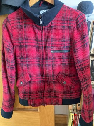 Cazadora estilo bomber con estampado de cuadros. Es talla L pero da poca talla, más bien una 40. - Cuello redondo. - Cierre de cremallera. - Bolsillo con cremallera en el pecho. - Bolsillos laterales con botón.