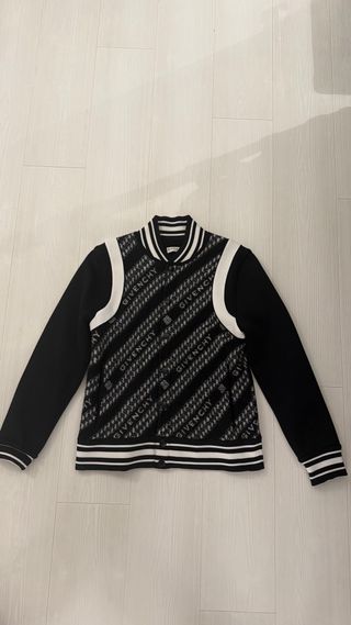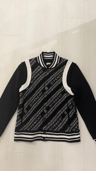 Cazadora estilo bomber de Givenchy con un diseño llamativo. - Mangas de punto negro. - Cuerpo con estampado de rayas diagonales y logo. - Cuello y puños de canalé con rayas blancas. chaqueta Givenchy Estado : impecable Lana 100% original 100% Comprado : boutique Givenchy Aventura Mall shops Miami Corte ajustado parece una M
