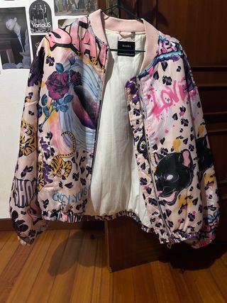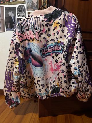 Cazadora bomber con un diseño vibrante y llamativo. - Estampado artístico con grafitis, animales y flores. - Cierre de cremallera frontal. - Puños y bajo elásticos.