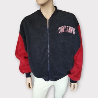 Chaqueta bomber Nike, talla L pequeña, color azul. - Diseño deportivo - Detalles en rojo y blanco - 2 bolsillos Tiene una mancha en una de las mangas, ver foto. Dimensiones aproximadas: - Hombros: 40cm - Largo: 60cm.