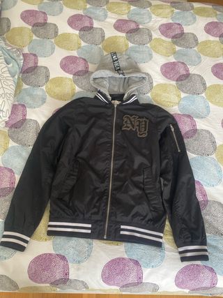 Cazadora bomber negra con capucha para niño de mas de 14 años. Talla 170 cm. 4 bolsillos. - Diseño con logo NY bordado en la parte delantera. - Puños y bajo con banda elástica a rayas. - Capucha con detalle de cinta. - Cremallera frontal.
