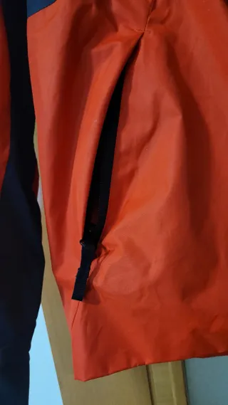 Cazadora juvenil con un diseño moderno y llamativo. - Diseño de rayas horizontales en azul y naranja. - Tejido con microestampado en tonos oscuros. - Capucha integrada. Vendo chaqueta original de la marca Rip Curl para niño/a. Tiene un diseño muy chulo con franjas horizontales en azul, naranja y gris sobre fondo negro.