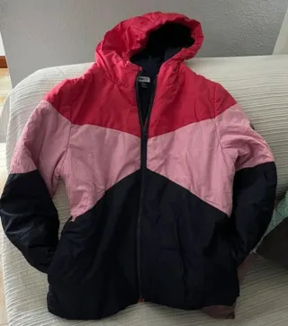 Cazadora reversible para niña con un diseño moderno y juvenil. - Un lado es azul marino con detalles en rosa y blanco. - El otro lado es rosa con mangas azul marino. - Capucha integrada. - Cierre de cremallera frontal. - Puños y bajo elásticos.