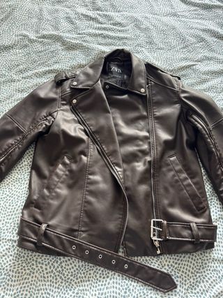 Cazadora estilo motero de Zara con un diseño moderno y versátil. - Acabado efecto piel. - Capucha integrada de tela, desmontable - Cierre de cremallera. - Bolsillos frontales con cremallera. - Puños y cintura elásticos.
