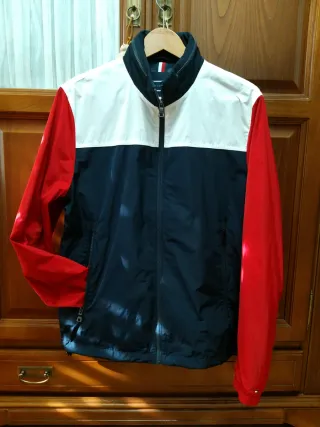 Cazadora deportiva con un diseño moderno y llamativo. De fibra sintética con tacto impermeable. - Mangas de color rojo. - Cuerpo principal en azul marino. - Paneles blancos en la parte superior. - Cuello alto con capucha recogida con cremallera. Forro interior de malla fina. Corte recto con ajustes en los laterales con goma. Ligera y fresca. Largo 70cm. Hombro 49cm. Mangas 69cm. Ancho abrochada 56cm. Esta en perfecto estado. No admito devolución.