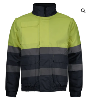 Cazadora bomber combinada de alta visibilidad con mangas desmontables, permite su uso como cazadora o como chaleco. Costuras termoselladas. Capucha escamotable. Cuello interior con forro polar en contraste para evitar la suciedad. Cierre central de cremallera con tapeta y botones de presión ocultos. Bolsillo de parche con tapeta y cierre de velcro en pecho. Bolsillos laterales dobles, con abertura vertical lateral, superior con tapeta y cierre de velcro. Bolsillo interior con cierre de velcro Guateado interior. Puños elásticos con tira ajustable. Faldón trasero con ajustes laterales. Cintura elástica. Bandas reflectantes cosidas. OE
