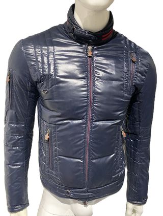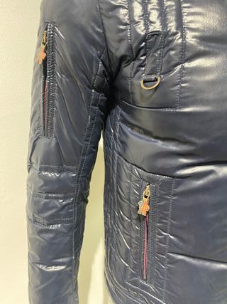 Cazadora de Moncler color azul, cremalleras en la parte delantera con cierre con cremalleras, placa del logotipo en los tiradores, bolsillo interior, etiqueta de la marca en la parte interior, cierre central de cremallera, tiras en el cuello y el bajo con botones de presión, doble puños de canalé elástico, bajo recto, esta en muy buen estado. Corte ajustado. Talla 1 Composición: 100% Poliamida. Relleno: 100% Poliamida. Ancho de hombro a hombro:44 cm. Ancho de axila a axila: 49 cm. Largo de manga: 65 cm. Largo: 62 cm