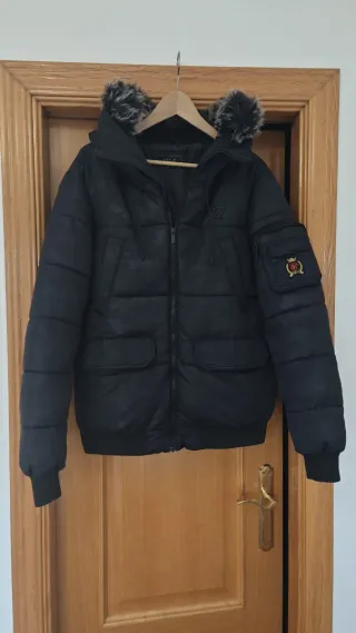 Cazadora SikSilk con estampado de camuflaje en tonos negros. Diseño acolchado con capucha y detalles de pelo sintético. - Cierre de cremallera frontal. - Bolsillos laterales con solapa. - Bolsillo adicional en manga con insignia. - Puños y bajo elásticos.