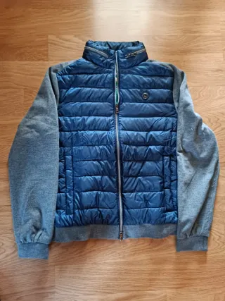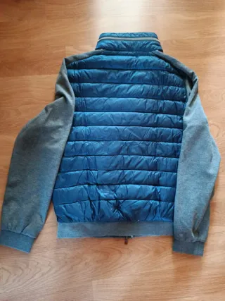 Cazadora El Ganso con cuerpo acolchado y mangas de punto. -Excelente estado - Cuerpo acolchado de plumas en color azul - Mangas en punto gris. - Cuello alto. - Cierre de cremallera.