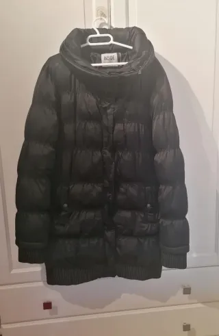 Cazadora acolchada de mujer, marca Inside, talla L, color negro. Cierre con cremallera y botones a presión, los bolsillos laterales llevan también botón a presión, . La capucha se puede recoger y formar el cuello de la chaqueta. Medidas: 85cm largo, 42 cm hombros y 50 cm axilas. Está usada pero en perfecto estado.