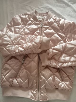 tipo bomber. color rosa acolchada y satinado. interior tipo sudadera.