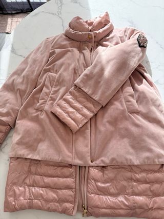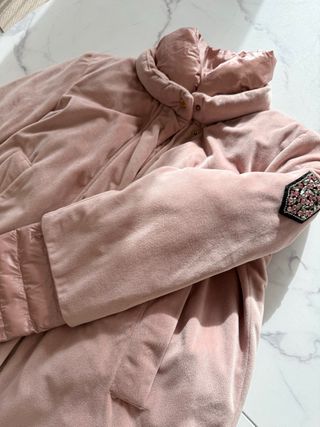 Cazadora acolchada de terciopelo en tono rosa. su orecio es de 179€ pero tiene un pequeño enganche en la muñeca, por eso la vendo barata. Es bomber y larga por el muslo, 83cm largo. - Cuello alto. - Cierre de cremallera. - Detalle de pedrería en el hombro.
