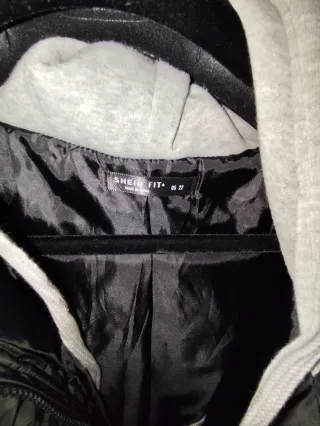 Chaqueta tipo bomber, muy abrigosa y original por la combinación de materiales, punto, parte delantera y liso, mangas, trasera y capucha. Solo la parte interior se nota el uso, como se ve en la foto. Del resto está bien cuidada.
