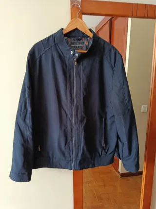 Cazadora estilo bomber de la marca McGregor. - Cierre de cremallera. - Dos bolsillos delanteros con botón. - Cuello redondo. Cazadora azul marino MçGREGOR. TALLA 52 A abundante. Acolchada. Entretiempo. Perfecto estado