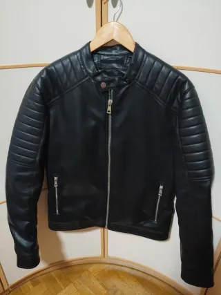 Chaqueta bomber de cuero de Pull&Bear, talla M. Es una prenda elegante y cómoda. - Diseño bomber. - Bolsillos con cremallera. - Detalles en las mangas. - Forro interior. - Marcas de desgaste.