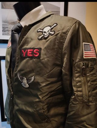 Cazadora bomber con muchas aplicaciones y distintivos en color verdoso TALLA S/M