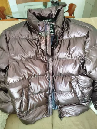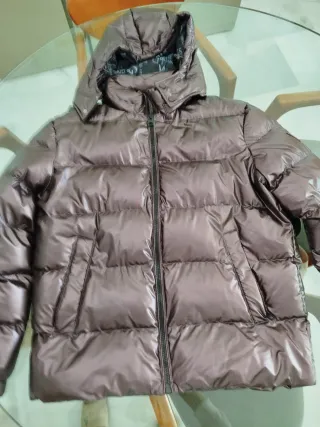 Cazadora acolchada con un acabado brillante y moderno. Es un color berengena metalizado, solo usado una vez. Lleva capucha extraible. Las fotos no muestran muy bien lo bonita q es... - Diseño acolchado. - Cuello alto. - Cierre de cremallera.