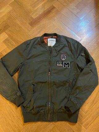 Cazadora estilo bomber de Springfield. - Color verde oliva. - Cierre de cremallera. - Bolsillos frontales. - Puños y bajo elásticos. - Detalle de parches en el pecho.