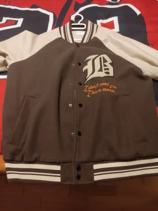 Cazadora estilo bomber de Bershka con un diseño moderno. - Cuerpo principal en color marrón. - Mangas en color beige. - Parche LB en el pecho. - Bordado I don't need you I have memes en naranja.