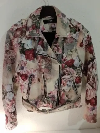 Cazadora con un estampado floral vibrante y detallado. - Diseño tipo biker. - Cremalleras metálicas. - Cinturón ajustable en la cintura. - Está en perfecto estado, usada una sola vez.