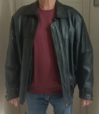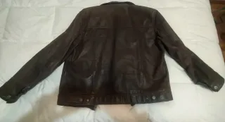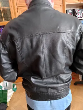 Cazadora de cuero para hombre. Aunque puse la talla L. de hombro a hombro 52, desde sisa a sisa 61 y largo desde sisa al final 32. en las fotos se ve los bolsillos que lleva. - Material: Cuero. - Diseño clásico y elegante. - Cierre de cremallera frontal.y automáticos - Bolsillos laterales.