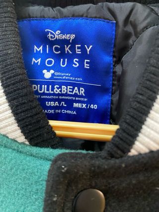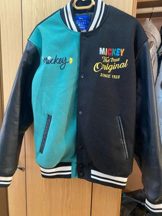Cazadora estilo universitario con diseño dividido en dos colores. - Mangas de cuero sintético negro. - Cuerpo principal en color verde azulado y negro. - Bordado de Mickey Mouse en la parte delantera. - Inscripción The true Original Since 1928 en la parte negra. - Cuello y puños de canalé con rayas blancas.