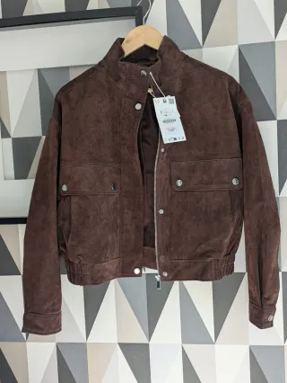 Cazadora de cuero auténtico de Zara. - Color marrón. - Diseño de cuello alto. - Cierre de cremallera. - Bolsillos delanteros con solapa.