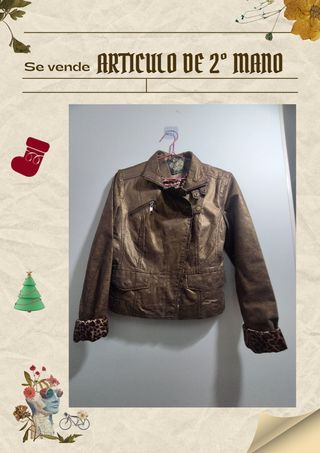 Cazadora de cuero color oro viejo. Forro y dobladillo de mangas diseño animal print Marca : Morgan de toi Talla : No hay etiqueta, podria ser una M o L (pongo medidas) De hombro a hombro : 40 cms De sisa a sisa : 48 cms Largo (desde el hombro) : 49 cms Largo (desde la sisa ) : 27 cms - Cierre frontal con cremallera. - Bolsillos con solapa. - Puños con estampado de leopardo.